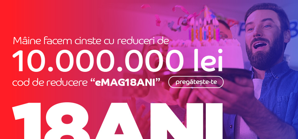 Ne pregatim de mare sarbatoare: marti, 3 decembrie, eMAG marcheaza 18 ani de cumparaturi online si ca de fiecare data in aceasta perioada se anunta reduceri consistente la zeci de produse. Cum de Black Friday nu am reusit sa definitivez lista de cadouri pentru cei dragi, maine dimineata incepand cu prima ora, voi fi cu ochii pe site sa vad care sunt cele mai bune oferte. In plus, un alt motiv de sarbatoare vor fi si voucherele oferite pentru comenzile plasate, un bonus de 10% din totalul cumparaturilor care se va adauga pe un card cadou pe care il vei putea folosi ulterior pentru alte cumparaturi.
